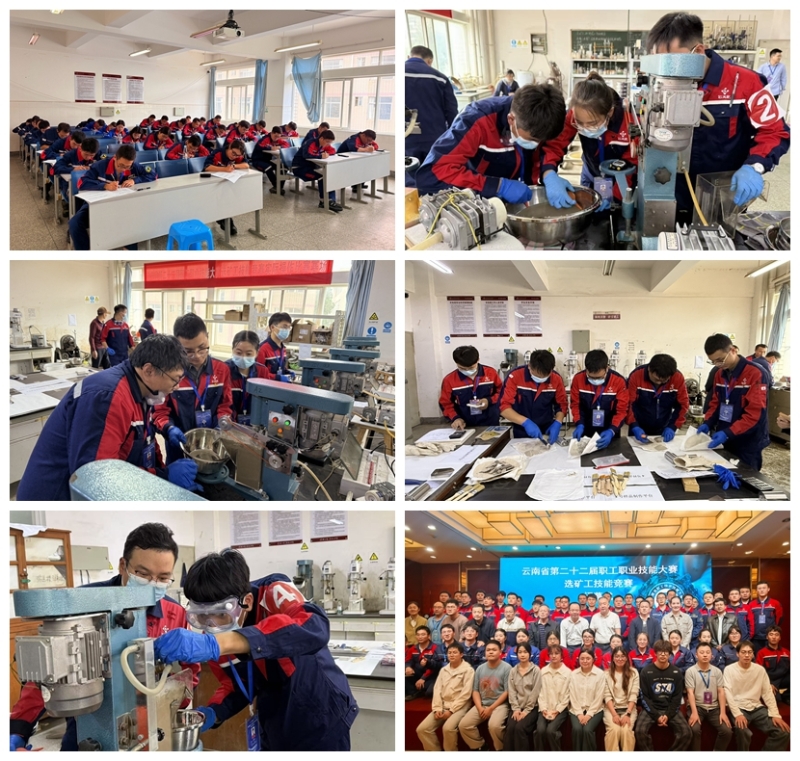按照競賽實施方案,經過層層選拔,共有來自云南錫業股份有限公司、云南黃金礦業集團股份有限公司等7家單位的42名選手參賽。此次競賽的個人競賽部分設置了理論知識競賽和實操個人賽兩大板塊,內容豐富且專業,涵蓋磨浮車間開機程序、浮選工藝參數計算、浮選現象判斷、礦物比重測定、礦漿濃細度判斷以及安全防護與現場應急等多個方面。團體競賽分為現場礦樣試驗和流程管路連接兩個項目。為確保競賽的公平公正,現場礦樣實驗設備統一,參賽團隊可自由選擇金屬礦礦樣或非金屬礦礦樣進行操作,真正做到了“以賽促訓、以賽提技”。